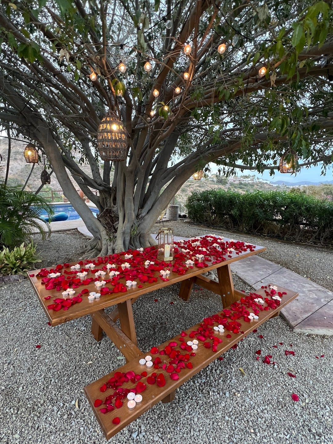 Only Alexis stood outside by the picnic table beneath a tree, the surface covered in a spa-worthy spread of rose petals and candles.