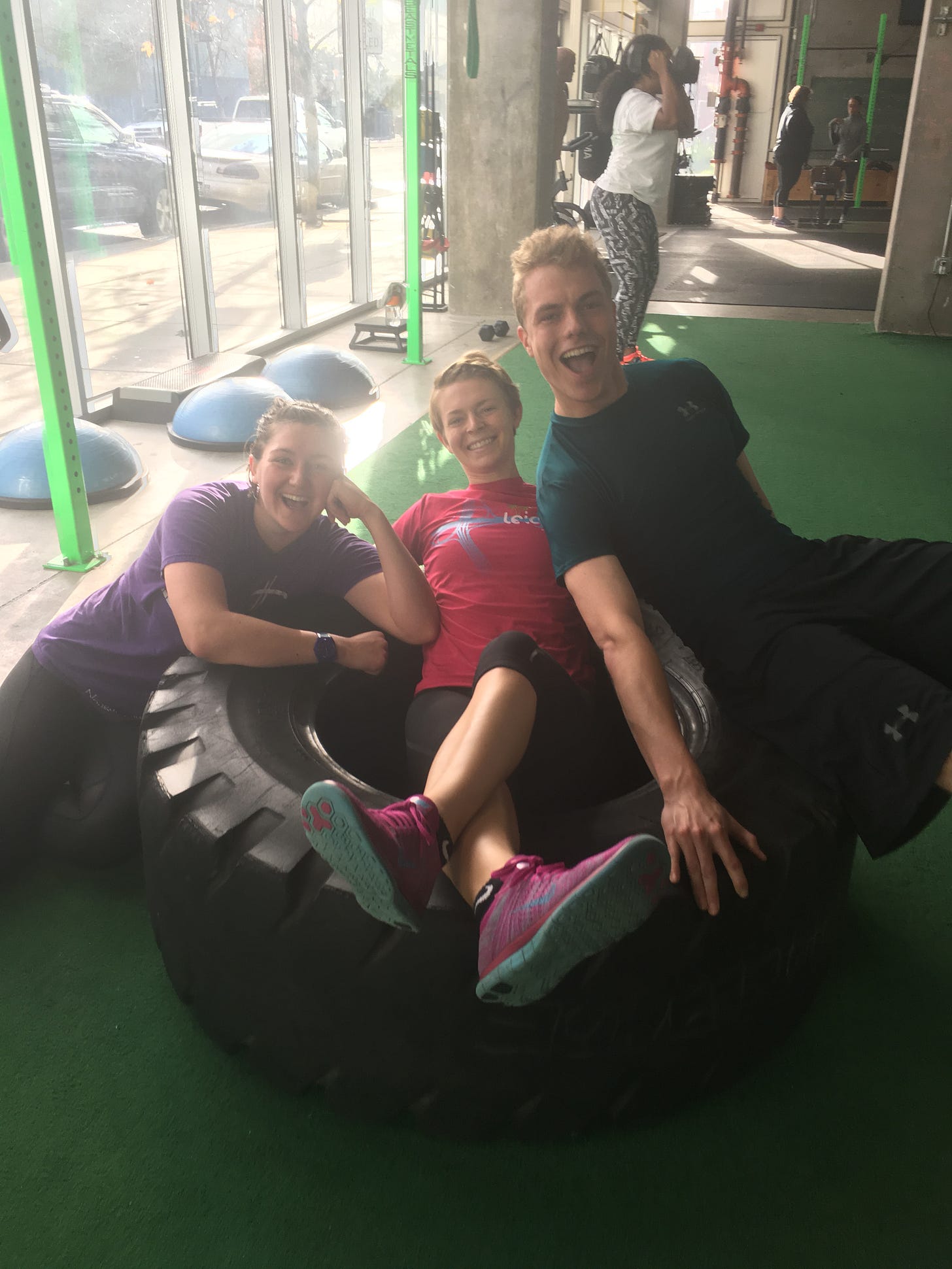 Above: Fiona, Alexis, and me resting in a tire after a grueling workout on New Years Day, 2017